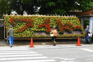 使用した花は約1300本。赤のサルビアで「ワイドー」の文字を作り、黄色とオレンジのマリーゴールドで引き立たせた。