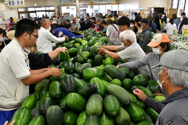 トウガンの魅力を広く市民にアピールし、地産地消と消費拡大を目指した「とうがんの日」キャンペーン(主催・同実行委)が10日、JAファーマーズマーケットあたらす市場で行われた。即売会では1個100円のトウガンを買い求めようと、販売開始前から長蛇の列ができた。用意された約2000個のトウガンは約3時間で完売した。