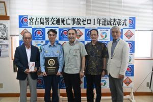 宮古島警察署(新垣健一郎署長)は10日、管内での交通死亡事故ゼロを1年間達成したとして、県警本部から表彰された。同署管内では2023年3月18日から24年3月17日までの1年間、交通死亡事故が発生しなかった。6回目の達成。宮古島地区交通安全協会(友利勝一会長)など関係機関・団体と連携し交通安全対策や広報啓発活動を推進し、事故抑止対策を推進したことが評価された。