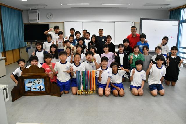 北小学校にトライアスロンの完走メダルを贈り続けている埼玉県の森岡秀文さんが15日、同校を訪問した。6年生に森岡さんは、生後間もない娘を亡くしたことや両親の介護などの経験を説明。「今、楽しく生活できていることに感謝してほしい。一日一日を大切に、1分1秒を無駄にしないこと。夢や希望に一歩ずつ近づける」と助言した。今大会で獲得した完走メダルを同校にプレゼントした。