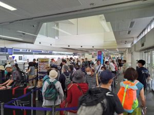 第38回全日本トライアスロン宮古島大会に出場した選手らが16日、帰路に就いた。宮古空港ではレースを終えたストロングマン(強人)たちの姿が多く見られた。選手たちはバイクを梱包した大きな荷物を預け、来年の再会を誓って島を離れた。
