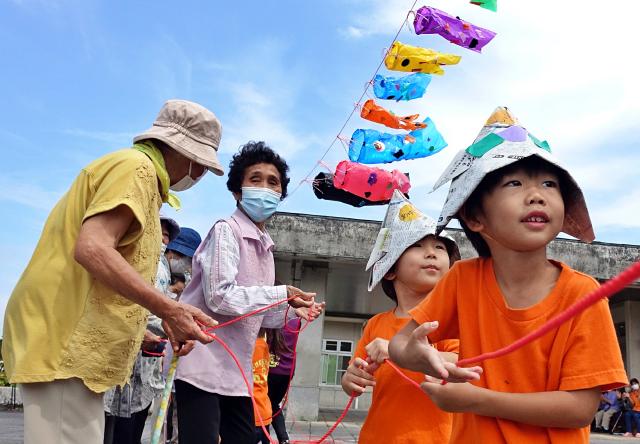5月5日の「こども日」を前に、市社会福祉協議会城辺支所で22日、こいのぼりの掲揚式が行われた。いけむらこども園の園児と同支所で開かれている城辺生きいき教室に通うお年寄りらが協力し合いながら50匹のこいのぼりを上空に引き上げて、元気に泳がせた。