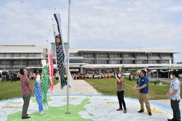 市こども家庭局は26日、5月5日から始まる児童福祉週間を前に市役所で子どもたちの健やかな成長を願って「こいのぼり掲揚式」を行った。公立や法人など計29園447人の園児が参加し、笑顔で元気よく市歌を斉唱し、「童のクイチャー」を踊った。座喜味一幸市長が音頭を取り、健やかな成長を願って全員で「ワイドー」と気勢を上げた。