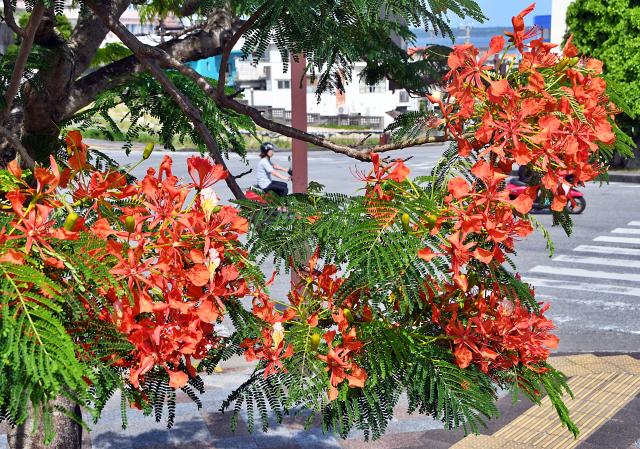 梅雨の足音が近づきつつある宮古島地方。初夏の青空が広がる6日、宮古島警察署平良交番前の交差点では、街路樹として植えられたホウオウボク(鳳凰木)の鮮やかな赤い花が風に揺れ、緑葉とのコントラストで見る人を楽しませた。