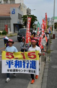 「5・15平和行進」(主催・平和運動センター宮古島)が11日、旧市役所平良庁舎を発着する市街地の6㌔のコースで行われた。労働組合の組合員や市民ら約80人(主催者発表)が「南西諸島の軍事要塞化反対」を訴えた。行進後は「平和とくらしを守る宮古郡民大会」を開き、「平和で自然豊かな宮古を子や孫につないでいく」などとした大会宣言を採択した。