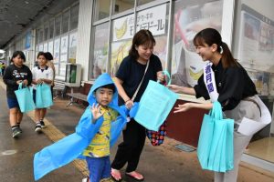 消費者月間(5月)にちなんだ消費者啓発キャンペーンが14日、平良西里の大型スーパー前で行われた。参加した県宮古事務所や市、宮古地区防犯協会などの関係者がチラシを入れたトートバッグを配布。消費者トラブルに注意するよう買い物客に呼び掛けた。