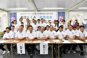 県議会議員選挙(6月7日告示、16日投開票)に向けて新人で初当選を目指す新里匠氏は16日、平良久貝の後援会事務所で政策を発表した。新里氏は4分野25項目の政策を示し、「特に訴えたいのは少子化対策。宮古を住み続けられる島にするため、逃げずにこの問題に立ち向かうことが大事だ」と述べた。