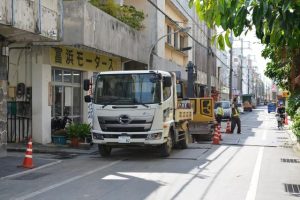 昨年12月から行われている県道78号線(西里通り)での公共下水道枝線工事で、ファミリーマート付近から宮古屋交差点付近の1工区の進捗(しんちょく)が4月末までで63・19%、旧福嶺医院付近からファミリマート付近までの2工区は75・2%となっている。工期は5月31日まで。