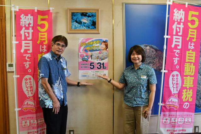 県宮古事務所(川上睦子所長)は17日、同所で会見し2024年度の自動車税を今月31日の期限内までに納付するよう呼び掛けた。川上所長は「自動車税は沖縄県の重要な自主財源。『滞納ゼロの島』を目指し、期限内納付への協力をお願いしたい」と語った。