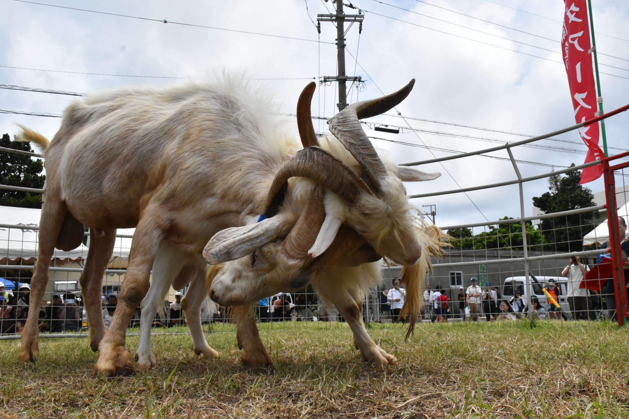 【多良間】第25回多良間島ピンダアース大会(主催・同実行委員会)が19日、村多目的広場で行われた。3階級に計29頭が出場し、角と角を激しくぶつけ合うなどして熱戦を繰り広げた。重量級は伊良部島から参加した「ジャックダニエル・イー号」が初優勝を飾った。