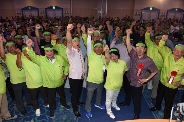 6月投開票の県議会議員選挙に立候補を予定している下地康教氏(64)=自民党県連公認、公明推薦=の総決起大会が26日、市内のホテルで開催された。大勢の支持者が詰め掛けて下地氏の2期目当選に向けて団結を誓い合うとともに、「ガンバロウ三唱」で気勢を上げた。下地氏は、「離島振興」の重要性を訴え支持を求めた。