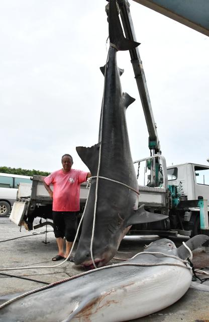 ダイブ宮古島代表で夏丸(宮古島漁協所属)船長の砂川博一さん(69)=城辺砂川=が27日、体長約5メートル、重さ500キロほどのイタチザメを2匹駆除した。「サメが出て困っている」との声を受けてボランティアで実施した。保良漁港の東側約1キロのパナリ岩礁近くで、はえ縄漁で仕留めたという。砂川さんは「みんなの安全のために駆除できて良かった。これからも困っている声があれば応えていきたい」と述べた。
