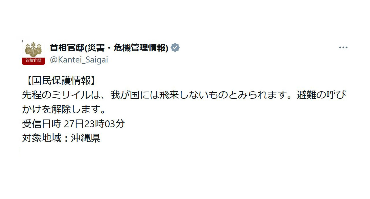 政府は27日午後11時3分ごろ、「先程のミサイルは、我が国には飛来しないものとみられます。避難の呼びかけを解除します」と発表しました。