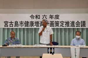 2024年度市健康増進計画策定推進会議(会長・座喜味一幸市長)が29日、市保健センターで開催された。経済団体や保健・医療福祉関係団体、教育関係団体などの代表らが出席。今年度から12年計画で実施される「健康みやこじま21(第三次計画)」について市健康増進課から説明を受けた。重点項目は▽20、30代の健診受診率向上▽子どもの肥満を減らす取り組み▽子どもの虫歯予防-の推進。