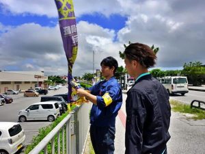 県管理道路違法占用物・違反広告物除去作業が30日、県内全域で行われ、宮古島市では県宮古土木事務所維持管理班が県道沿いにある違法な広告物、のぼりなどを撤去した。この中には、6月に行われる県議会議員選挙の立候補予定者の「のぼり」も多く含まれている。