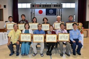宮古島地区防犯協会(前川尚誼会長)の2024年度第70回定期総会と防犯功労表彰式が31日、七原コミュニティーセンターで開かれた。総会では24年度の事業計画案など4議案を承認した。表彰式では前川会長と宮古島警察署の新垣健一郎署長から1団体に感謝状、13個人・団体に防犯功労表彰として賞状と記念品が手渡された。
