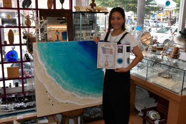 平良西里のアクセサリーショップ「海工房」の作家・進藤潤(めぐみ)さんがこのほど、宮古の海をモチーフにした作品で国内外のダブル受賞を果たした。第29回日本の美術(主催・クオリアート)彫塑(ちょうそ)・陶工芸部門にレジンアート「宮古島の海」を初出品し部門賞を受賞。さらに、「世界芸術競技inパリ2024」(主催・同)に初出品した「地球の海」が来場者の投票で選ばれる「人気アーティスト賞」に輝いた。