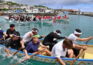 向こう1年間の航海安全と豊漁を願う海の祭典「ハーリー(海神祭)」が旧暦5月4日(ユッカヌヒー)に当たる9日、佐良浜漁港など12カ所の会場で開催された。今年は雨の影響で、各会場とも当初予定していたスケジュールを変更するなどして開催。それでもメインイベントのサバニ競争で一気に盛り上がった。漁師や青年らのこぎ手が「ゴーヘイ、ゴーヘイ」の掛け声に合わせ、力強いかいさばきで水しぶきを上げると、会場は歓声と興奮に包まれた。