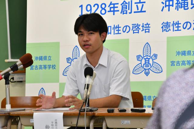 沖縄全戦没者追悼式で「平和の詩」の朗読を行う宮古高校国際探究科3年の仲間友佑さんが14日、同校で会見を行い、作品が選ばれた喜びと追悼式に臨む心境を語った。仲間さんは「現状の世界に対する怒りであったり、平和への思いを書き、伝えたりしたいと思った。朗読者に選ばれたことは光栄なことであり、うれしい」と語った。朗読者が選ばれるのは同校からは3人目、宮古地区としては7人目となる。