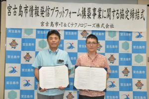 宮古島市(座喜味一幸市長)とT&Cテクノロジーズ(本社・那覇市、與那嶺一貴代表)は14日、市情報発信プラットフォーム構築実証事業に関する協定を締結した。締結式が市役所で行われ、久貝順一企画政策部長と與那嶺代表が協定書を交わした。同実証事業では市の公式ライン(SNS)に受信設定機能や防災ツールなど機能拡張を行う。運用は8月末のスタートを計画している。