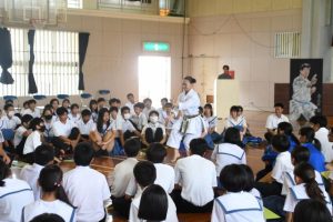久松中学校(下地直樹校長)で14日、教育講演会が開かれた。多良間島出身で空手世界選手権優勝経験がある豊見城あずささんが「空手を通した人生を伝える」と題し、自身の人生や経験を紹介するとともに、攻撃と防御の技を組み合わせた形を演舞した。講演で豊見城さんは「何か熱中できることを見つけてほしい。どんな好きなことでも情熱をささげ続ければ人生が開けていく」と話した。