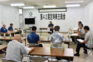 宮古食肉センターの第42期定時株主総会が29日、JAおきなわ宮古地区本部で行われ、収益率の向上に向けた2024年度事業計画書など3議案を承認した。23年度は104万8000円の黒字決算となった。総会前の取締役会では、座喜味一幸市長が任期(25年6月末まで)途中で取締役を辞任することを確認。後任人事は調整中という。