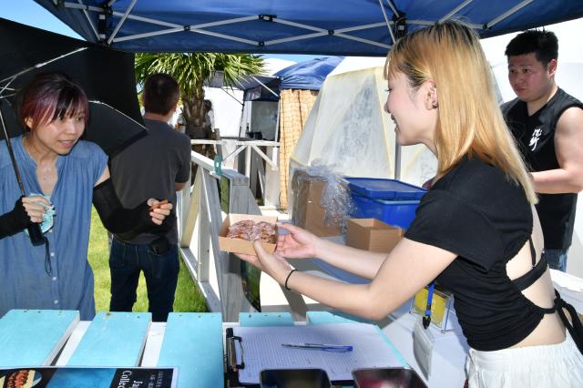 「肉フェス伊良部2024」(主催・グランテックリゾートヘブン)が29日、伊良部長浜の同施設で始まった。地元伊良部島や宮古島から計9店舗が出店し、自慢の肉料理を提供している。期間はきょう30日まで。入場無料。料理の購入はチケット制(1枚550円)。時間は午前11時~午後9時。
