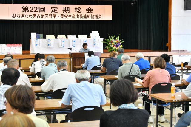 宮古地区野菜・果樹生産出荷連絡協議会(上地宏明会長)の第22回定期総会が2日、JAおきなわ宮古地区本部大ホールで行われ、販売額9億5000万円達成を柱とする2024年度の事業計画案と予算案を承認した。役員改選では、下地堅士朗さん(城辺支部)が新会長に選任された。23年度における優良農家の表彰も行われ、受賞者がさらなる飛躍を誓い合った。