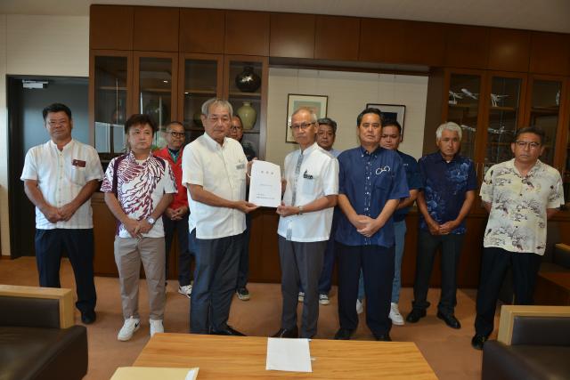 県建設業協会宮古支部(友利勝人支部長)は4日、市役所に座喜味一幸市長を訪ね、最低制限価格の設定および決定方法の係数の引き上げなどを要請した。座喜味市長に代わり嘉数登副市長が対応。同支部のメンバーらは建設業界の深刻な人手不足などを説明し「特段のご高配をたまわりたい」などと要望書を手渡した。