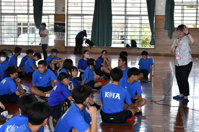 県の沖縄平和啓発プロモーション事業(御万人ぴーすふるアクション)による「次世代ワークショップ・平和教育出前授業」が11日、北中学校(渡久山英徳校長)で3年生130人を対象に行われた。宮古での同事業は初めて。事業を受託運営する「うなぁ沖縄」の玉城直美さん、神山怜奈さんを講師に、生徒たちが難民問題や沖縄戦への認識を深め、平和を希求する「沖縄のこころ」を学んだ。
