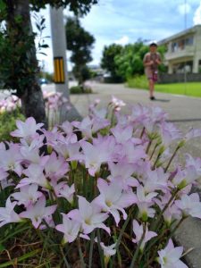 梅雨明け後、まとまった雨が少ない宮古島だが市内各地の沿道では、ピンクや黄色のレインリリー(ゼフィランサス・ハブランサス)の花が咲き誇り、見る人の目を楽しませている。