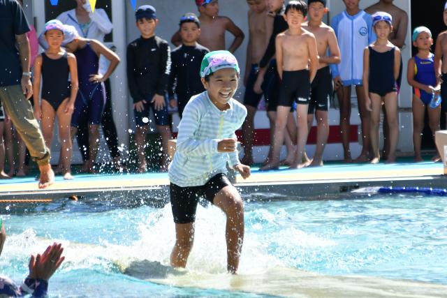 宮古島水泳スポーツ少年団(稲垣聖司団長)は15日、水面に浮かべたござを走る「第1回GO THE RUN(ゴザラン)」を平良中学校プールで開催した。団員の小中学生をはじめ、保護者らも参加。水しぶきを上げながら不安定なござの上を走り抜け、歓声を響かせた。