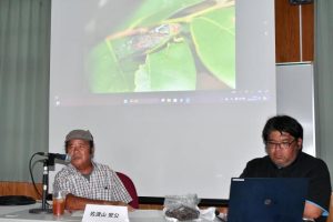 市教育委員会は19日、市歴史文化資料館で会見し、ツマグロゼミの羽化調査について、上野新里の増殖施設敷地内や同豊原ウナトゥ地域の生息コロニーなどで計974個体を確認したと報告した。7年目となる調査を行った佐渡山安公さんは「徐々に個体数が減ってきている」とした上で、増殖に向け、「施設を改築し今年発見したウナトゥのセミとの交配で近親交配の対策が図られる」と語った。