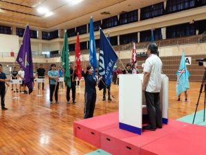 第51回宮古体育大会(主催・市スポーツ協会)の開会式が21日、市総合体育館で行われた。18学区の代表選手らが参加し、計16競技で日頃の練習成果を発揮して競い合うとともに交流の輪を広げることを誓った。開会式では、スポーツ功労賞の表彰も行われ、砂川会長から平良進さん(市陸上競技協会)、前川直喜さん(宮古野球連盟)、平良武さん(同)、根間康雄さん(宮古剣道連盟)に賞状などが贈られた。