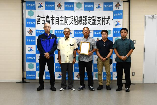 自主防災組織への認定証交付式が23日、市役所で行われ座喜味一幸市長から上野自治会自主防災会の根間正三郎会長に認定証が手渡された。市と「自分たちの地域は自分たちで守る」を掲げて組織された同自主防災会は安全安心で住みよい地域づくりに向けてさらなる連携強化を図るとしている。