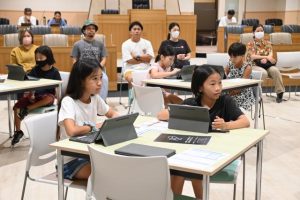 楽しく学んで行動しよう!「海のSDGs」(主催・イエローピンプロジェクト、共催・宮古島ICT交流センター)が26日、旧下地庁舎内の同センターで行われた。市内の小学生が参加し、宮古の豊かで美しい海を守るため、プログラミングを通して海の社会課題解決について楽しく学習した。27日も引き続き開催される。