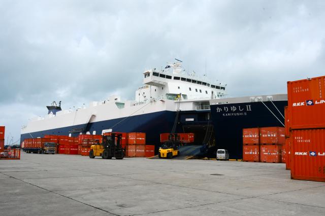 琉球海運(那覇市、比嘉茂社長)は27日、博多-那覇間に就航した新造船「かりゆしⅡ」を臨時に先島路線で運航した。宮古島地方は、台風3号による海上の影響で22日を最後に貨物船が欠航しており、5日ぶりに生活物資などが到着した。同船の平良港への入港は初めて。南西海運の「よね丸」も同日入港した。