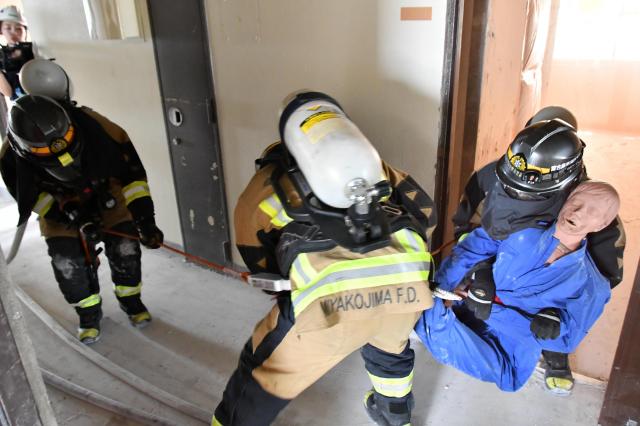 市消防本部(上地一史消防長)の火災防御訓練が30日、建て替え工事中のホテルニュー丸勝(平良勝久社長)の協力を得て、平良西里の同ホテルで行われた。客室で出火したと想定し、参加した消防職員・団員計31人が要救助者の捜索や救出、放水など本番さながらの訓練に取り組んだ。