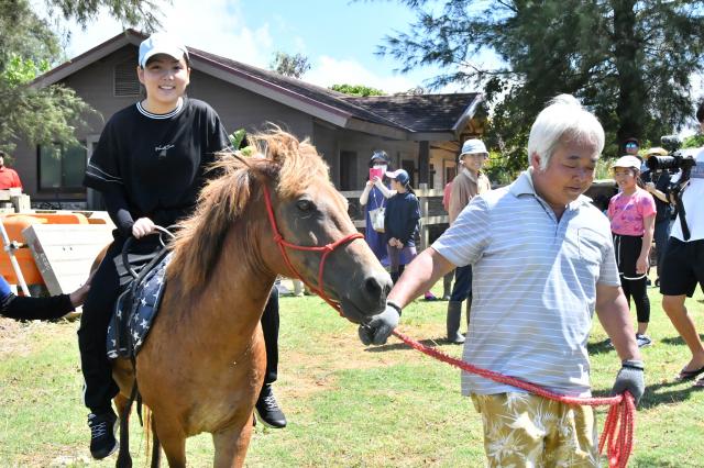 沖縄在来場の宮古馬に理解を深めてふれあいを楽しもうと、夏休み親子牧場体験(主催・沖縄在来馬保存事業実行委員会)が2日、下地の宮古島熱帯果樹園「まいぱり」で行われた。7組14人の親子が参加し、宮古馬の歴史を学びながら乗馬体験や餌やりなどで触れ合いを楽しんだ。