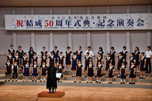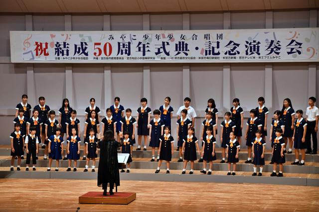 みやこ少年少女合唱団(宮国貴子団長)の「結成50周年式典・記念演奏会」が4日、マティダ市民劇場で開催された。式典では、50周年の節目を祝うとともに、歌を通して心を育み絆を深めて歌い継いでいくことを決意した。演奏会では合唱団員であることを誇りに、あしたや未来へつないで行く気持ちを歌にして披露した。特別ゲストでソプラノ歌手の砂川涼子さんのリサイタルが花を添えた。