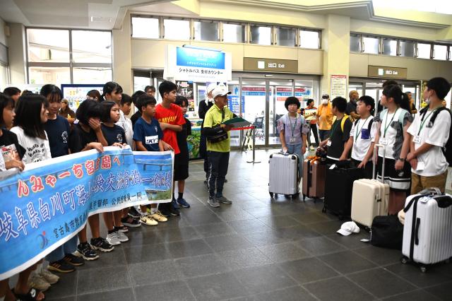 岐阜県白川町の児童15人が「海・山体験交流宿泊研修会」のため6日、来島した。下地小学校の児童たちが横断幕を用意し、宮古空港で盛大に出迎えた。児童たちは8日までの2泊3日の日程で交流し、観光をしたり、マリンスポーツを楽しんだりして宮古ならではの夏を楽しむ予定。