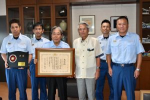 消防功労者総務大臣表彰を受けた市消防団団長の前川尚誼さん(71)が7日、座喜味一幸市長に受賞の喜びを報告し、「入団から32年頑張れたのは周囲の後押しのおかげ。団員が一生懸命やってくれたので受賞できた。この賞に恥じないよう、消防団のみんなと一緒に市民の安全・安心と生命、身体、財産を守れるよう頑張っていきたい」と意欲を示した。