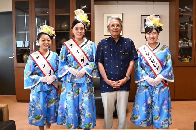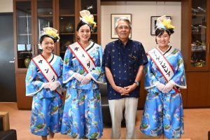 新たに第50代のミス宮古島に就任した3人が8日、市役所に座喜味一幸市長を訪ねあいさつした。3人は「公務を通してたくさんの人に宮古島をPRしたい」と抱負を語った。 訪ねたのはミスサンゴの坂田祐梨(ゆり)さん(27)、ミスティダの友利李南(りいな)さん(23)、ミスブーゲンビレアの室田渓(けい)さん(26)。
