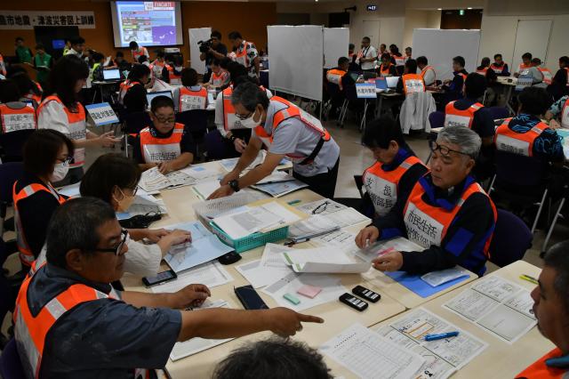 市地震・津波図上訓練が9日、市役所大ホールで実施された。117人の職員が参加して、市内で大規模な地震・津波の発生した際の初動態勢や役割分担などを確認した。行政が防災コンサルタントを行う「琉球国際航業」の山﨑晴彦さんが「情報の収集はできているが共有ができていなかった。もう少し工夫できればもっと良くなっていく」と講評。同訓練は6年ぶりに行われた。