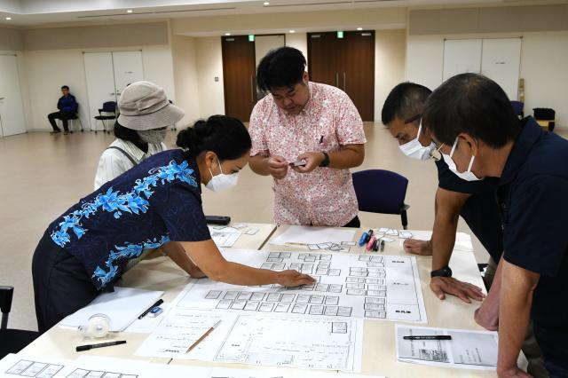 市防災危機管理課は10日、避難所運営ゲーム「HUG(ハグ)」訓練を行った。訓練は宮古島に大地震が起きたという想定で開かれ、参加者は五つのグループに分かれ、避難者の年齢、性別、国籍やそれぞれが抱える事情に適切に対応できるか、模擬体験した。