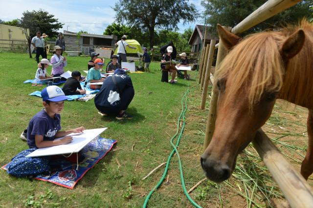 子どもたちに宮古馬を身近に感じてもらおうと市教育委員会は10日、下地の宮古島熱帯果樹園「まいぱり」で写生会を開催した。放牧されてのんびりと歩く宮古馬をスケッチしたり、餌やりを体験したり、シート-ヤー(昔の製糖場)で宮古馬が歯車を引く光景を観察したりして夏休みの楽しい思い出にした。
