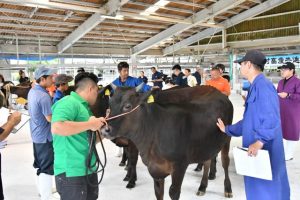 宮古地区畜産共進会(主催・宮古地区農業振興会)が13日、JAおきなわ宮古家畜市場で開かれた。宮古島市と多良間村の代表19頭を審査した結果、若雌第2類で優等賞の湧川畜産(多良間)所有の「さくらりぼん」号が特別賞の県農林水産部長賞も受賞した。若雌第1類は湧川惺穂さん(多良間)が所有する「ひめゆり6」号、高等登録群は豊見城畜産(多良間)の母牛「ゆうこ」号、娘牛「ゆりひめ」号が優等賞となった。