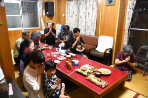 旧盆入りの16日夜、市内の家々では亡くなった人たちの世界とされる後世(グソー)から先祖の霊を迎えた。「ンカイ(迎え)」は家族や親戚らが集まり、ごちそうや果物、先祖のつえとされるサトウキビなどを供えた仏壇に手を合わせて、家族の健康と子孫繁栄を祈った。