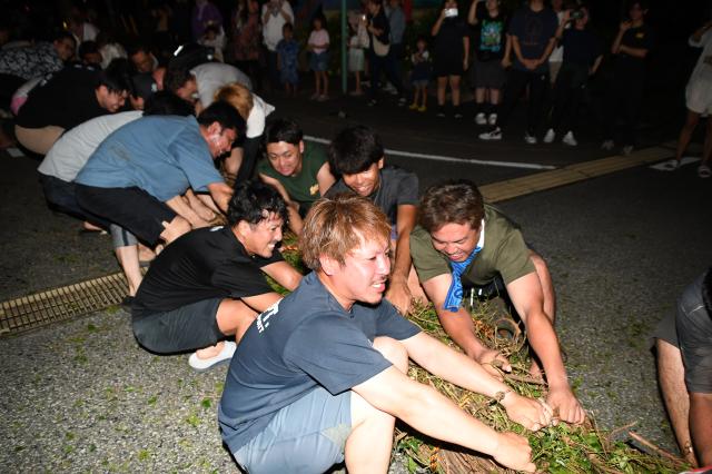 旧盆の「送り日」に毎年、上野宮国で行われる伝統行事「宮国大綱引き」が18日、宮国公民館前の通りで行われた。勝負の結果、今年は2連勝で西軍が勝利。若者たちは歓喜し、クイチャーを踊って喜びを表現した。
