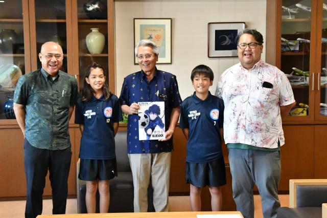 第51回藤枝JC杯争奪全国少年少女サッカー大会に出場した宮古地区トレセンU-12の選手たちが20日、市役所に座喜味一幸市長を訪ね、大会結果を報告した。参加64チーム中15位に入る健闘をみせた。主将の大渕芽依さん(久松FC6年)は「とても宮古島では戦えない強いチームやプロが使うスタジアムで試合ができ、とても楽しかった」と述べた。